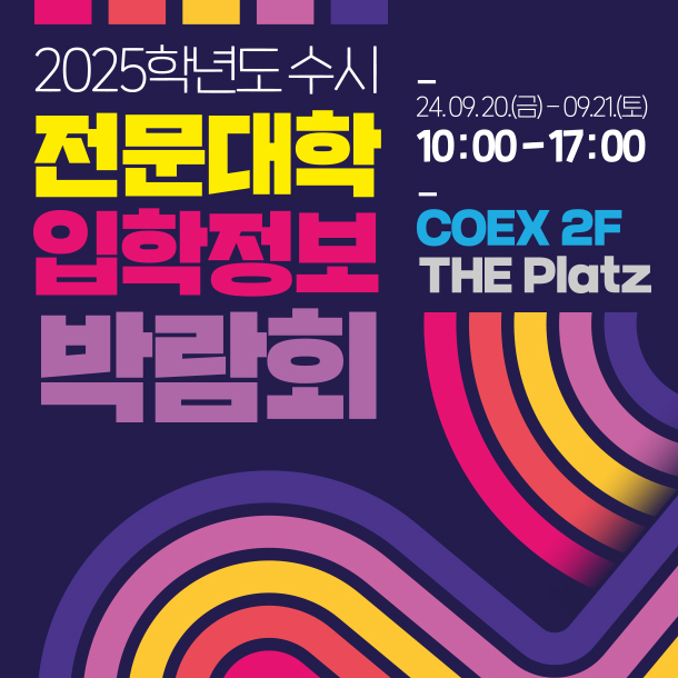 - 2025학년도 수시 전문대학 입학정보박람회가 오는 2024년 9월 20일(금)부터 9월 21일(토)까지