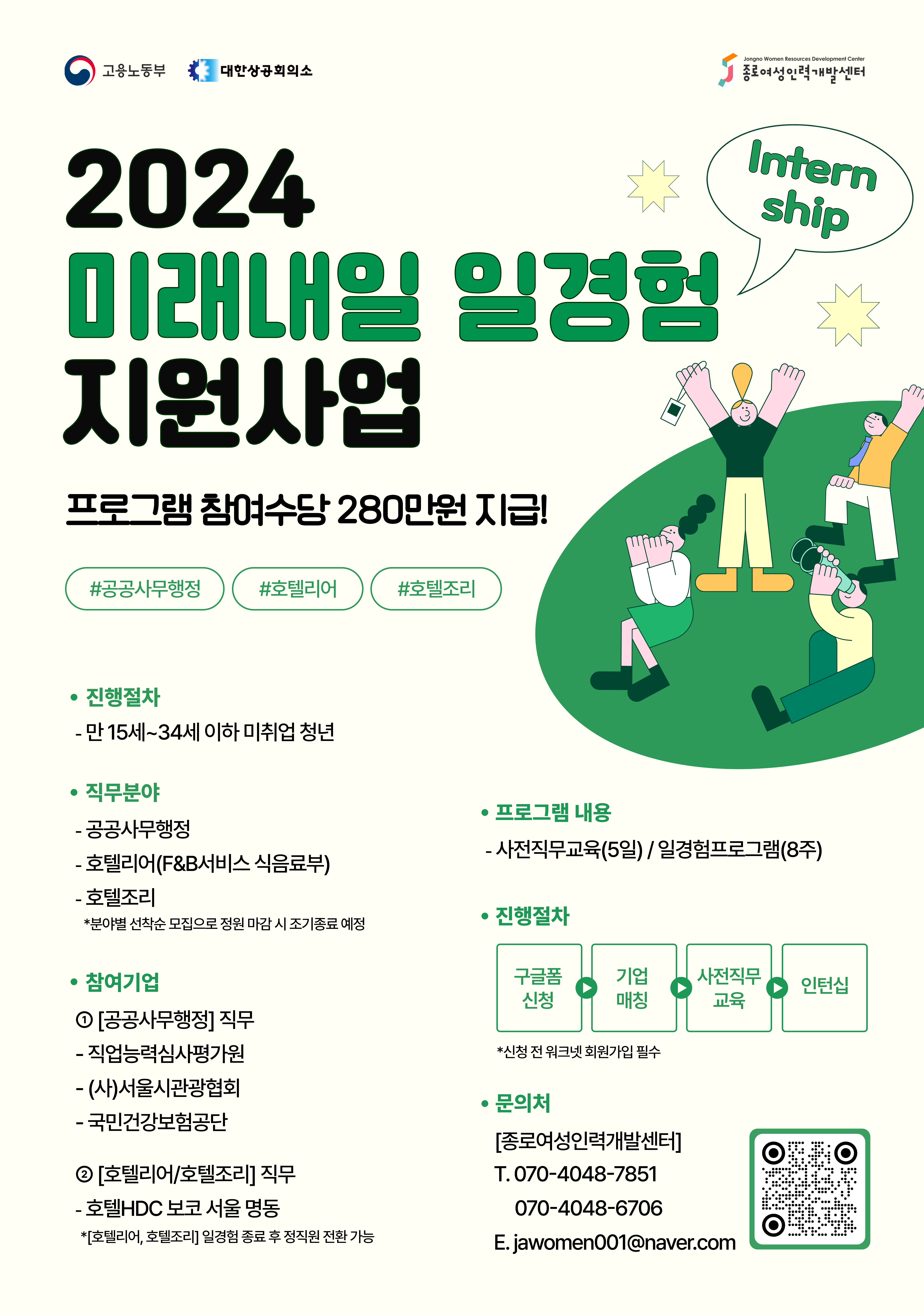 [고용노동부] 미래내일일경험 참여자 모집(호텔리어/호텔조리/사무행정) ○ 행사개요 2024년 미래내일 일경험 인턴형 참여자 모집 (선착…, 전시,포럼,세미나,축제정보를 마이스포털 코드엠에서
