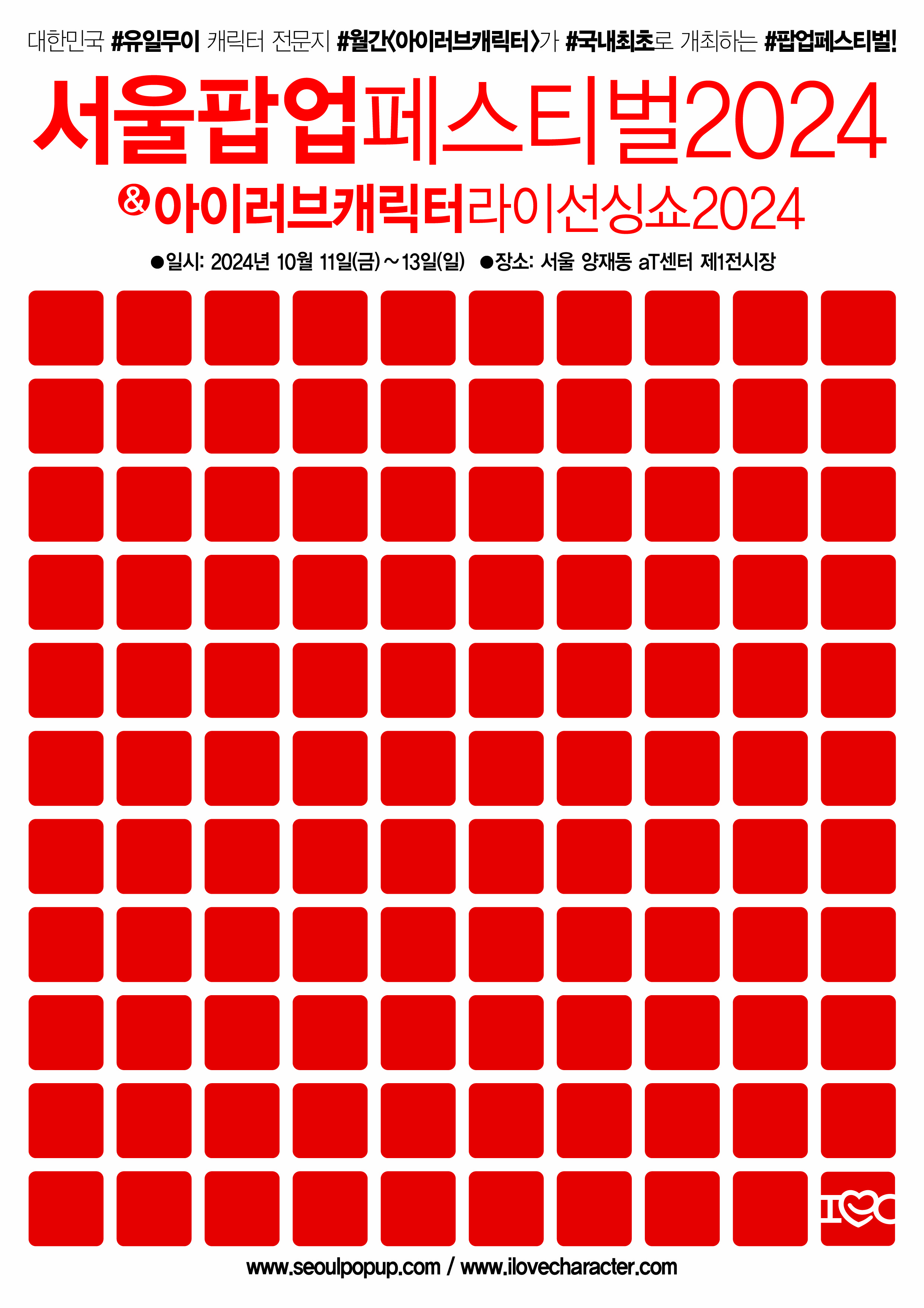 - 서울팝업페스티벌 2024와 아이러브캐릭터라이선싱쇼 2024는 2024년 10월 11일부터