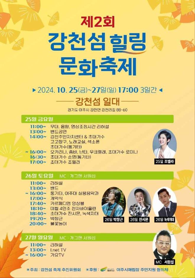 - 강천섬 힐링 문화축제는 남한강과 넓은 잔디밭, 은행나무길 등 아름다운 자연과