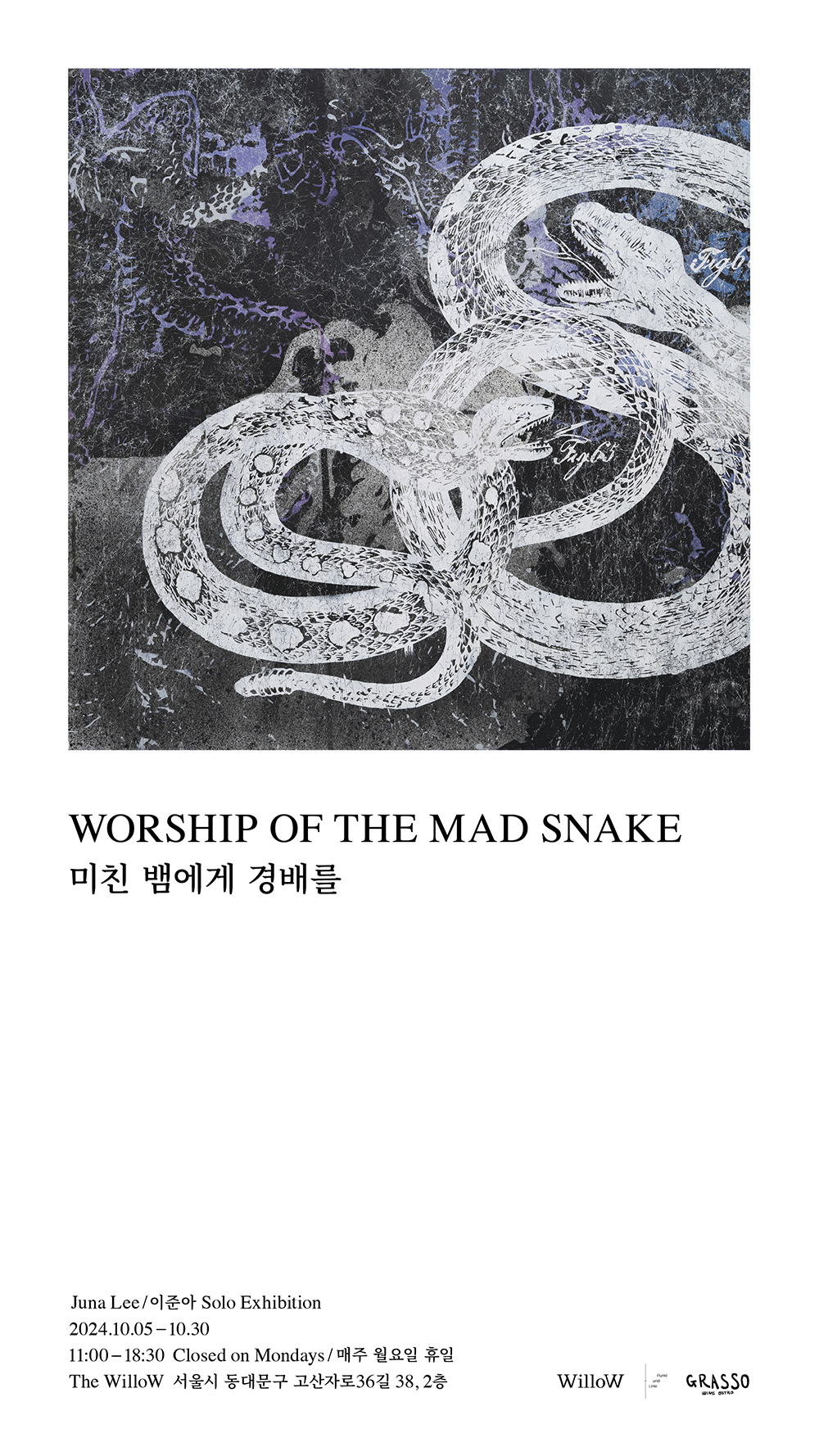 이준아 개인전: 미친 뱀에게 경배를 ○ 행사개요 - 더 윌로에서 이준아 작가님의 개인전을 전시합니다! ○ 행사일정 및 장소 - 행사…, 전시,포럼,세미나,축제정보를 마이스포털 코드엠에서 확인