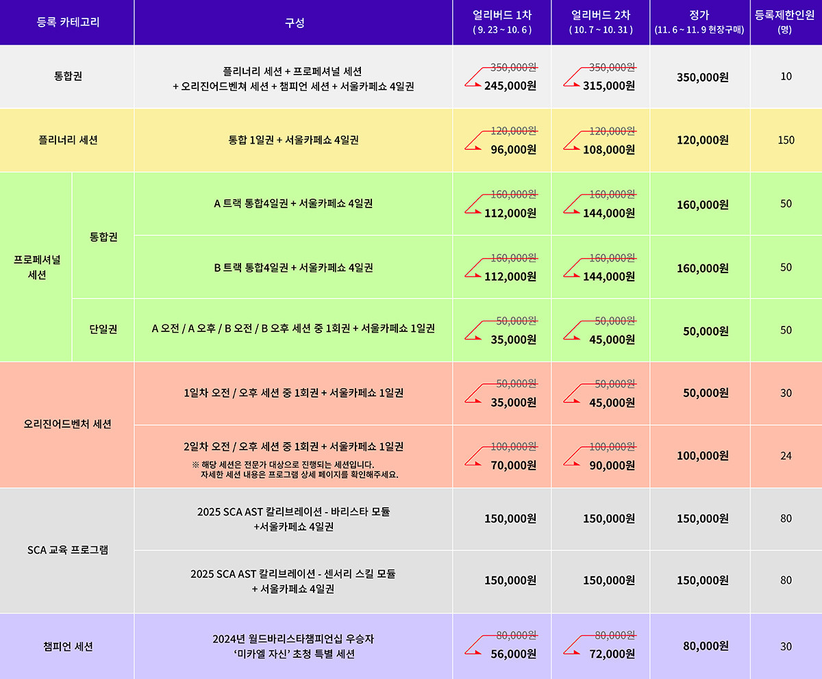 - 플리너리세션, 프로페셔널세션, 오리진어드벤쳐세션, SCA교육프로그램, Global Coffee