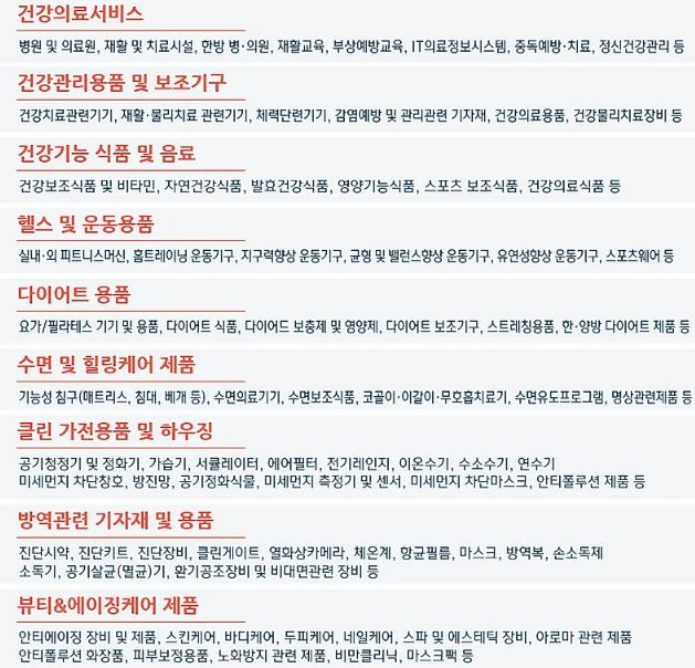 관리 용품, 건강 기능 식품, 헬스 및 운동용품, 다이어트 용품, 수면 및 힐링케어 제품, 클린 가전