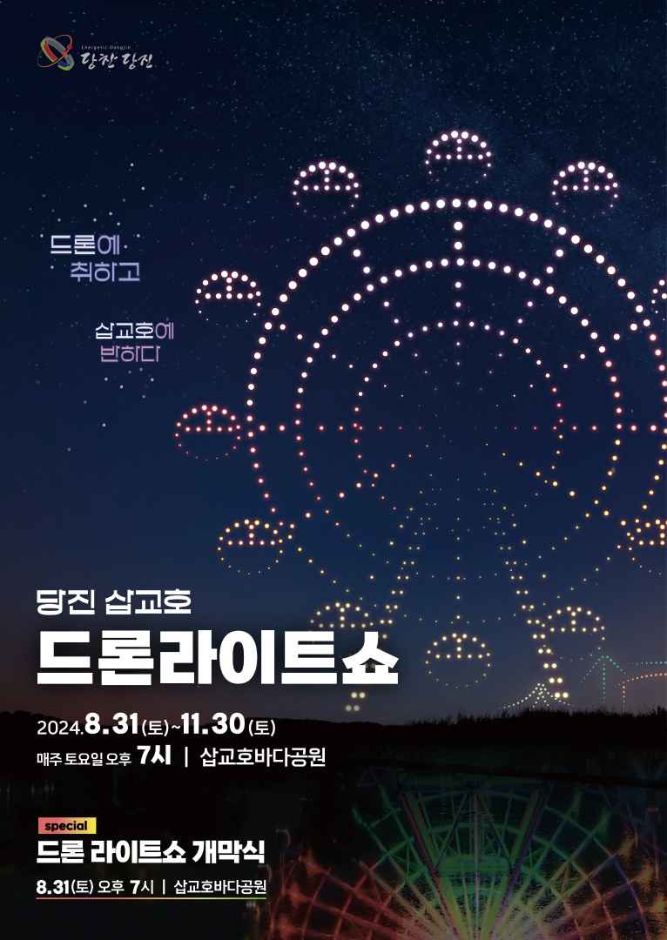 2024 당진 삽교호 드론라이트쇼 ○ 행사개요 - 8월부터 11월까지 매주 토요일 저녁, 삽교호의 밤하늘을 아름답게 수놓을 ‘중부…, 전시,포럼,세미나,축제정보를 마이스포털 코드엠에서 확인할 수