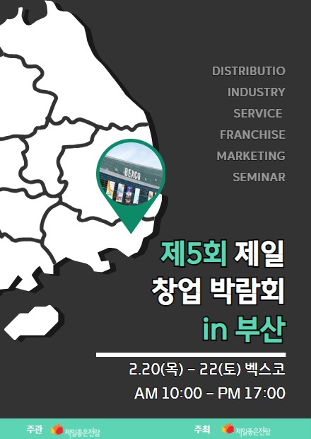 제5회 제일창업박람회 in 부산 ○ 행사개요 - 벡스코에서 제 5회 제일창업박람회 in 부산을 진행합니다. ○ 행사일정 및 장소 -…, 전시,포럼,세미나,축제정보를 마이스포털 코드엠에서 확인할 수