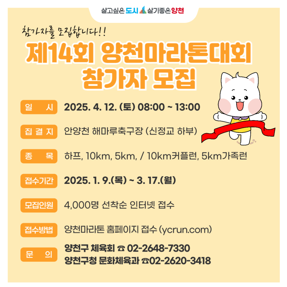 <제14회 양천마라톤대회> ○ 행사개요 - 2025년 4월 12일 (토) ‘제14회 양천마라톤 대회’가 열립니다! ○ …, 전시,포럼,세미나,축제정보를 마이스포털 코드엠에서 확인할 수 있습니다. 마이스포털