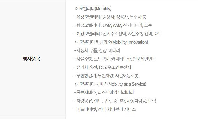 - 완성차 전시, 서울모빌리티어워드, 모바일로보틱스월드. 디자인페스티벌, 국제컨퍼런스, 자율주행차 시승 등