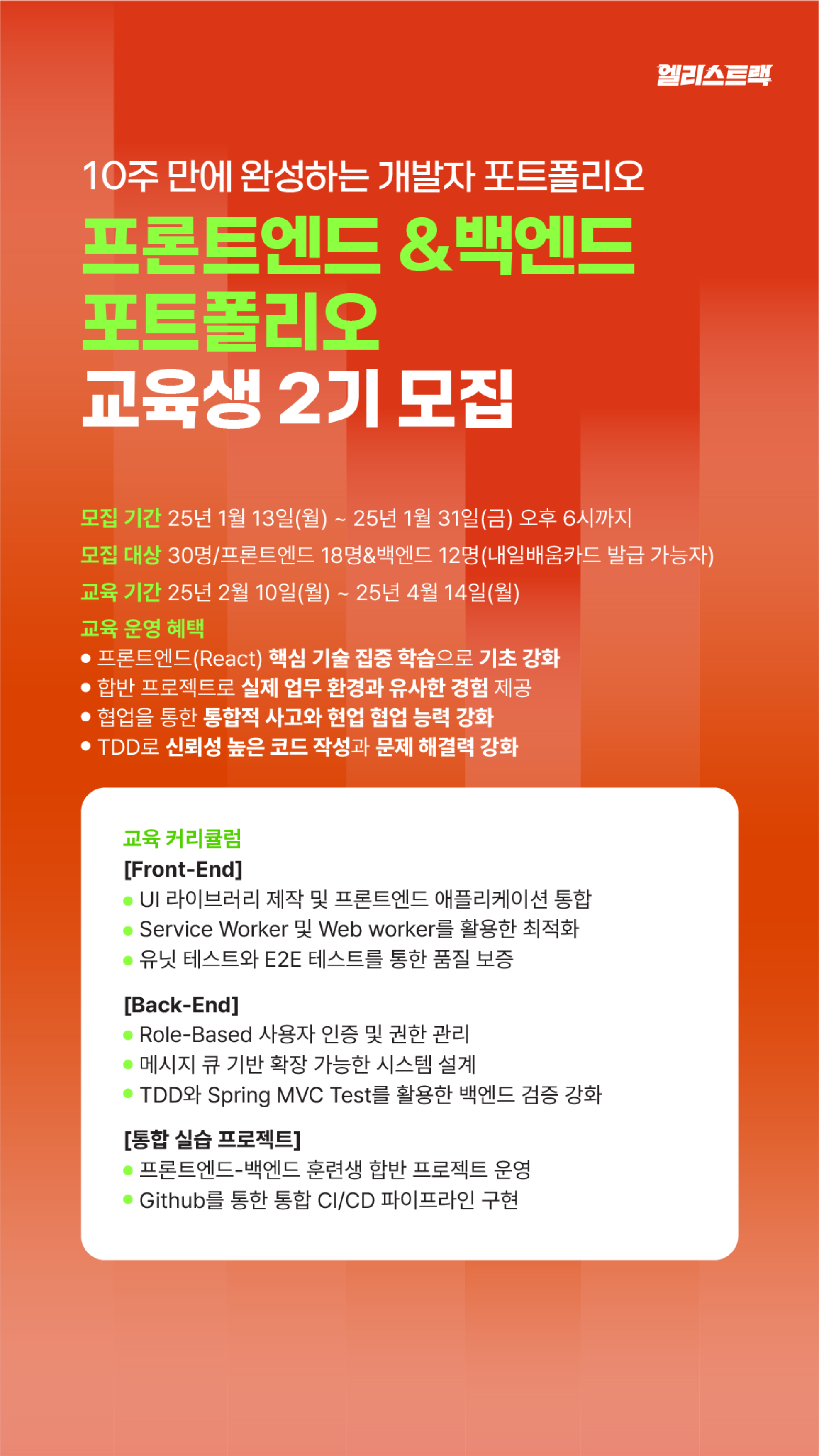 [1기 조기마감 / 교육비 전액무료] 엘리스 개발자 심화 포트폴리오 교육생 2기 모집