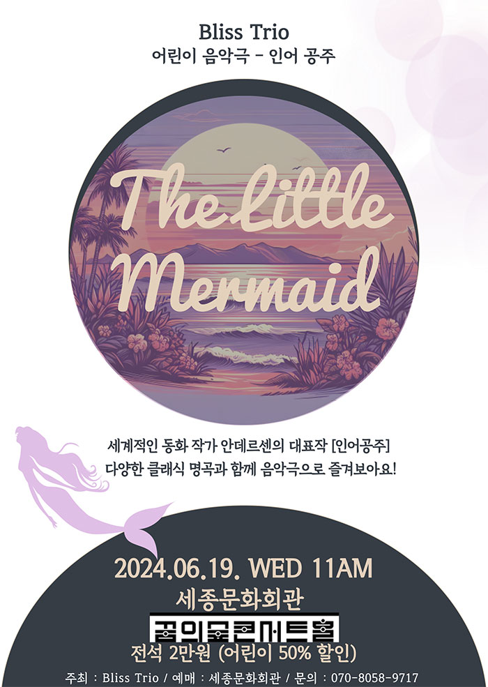Trio Bliss의 인어공주 이야기 ○ 행사개요 ○ 행사일정 및 장소 - 행사 일정 : 2024.06.19 (수) - 행사…, 전시,포럼,세미나,축제정보를 마이스포털 코드엠에서 확인할 수 있습니다. 마이스포털 코드엠