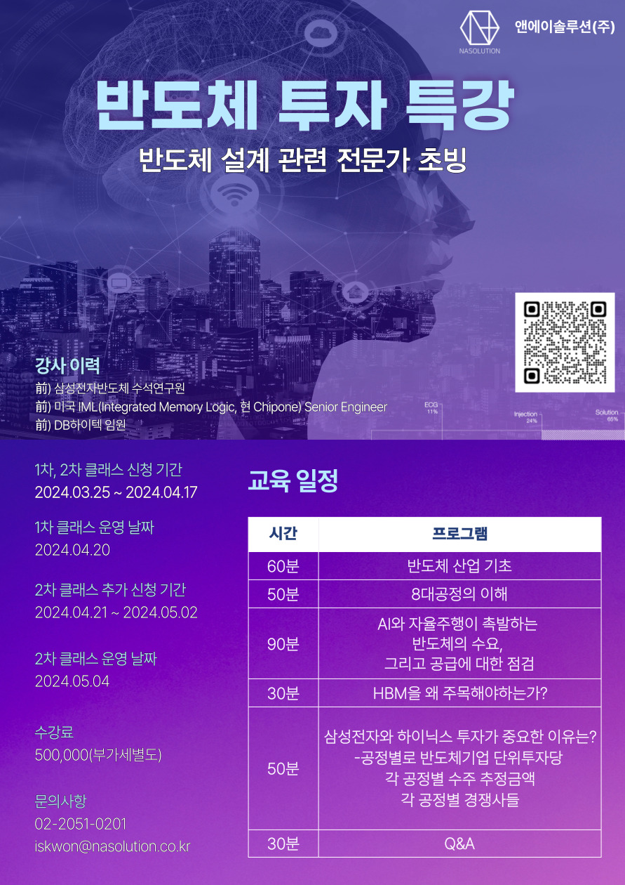 반도체 투자 특강 ○ 교육개요 - 본 강의는 주식투자자만을 위한 투자 강의가 아닌, AI, HBM등 빠른 반도체 산업 변화를 이해하…, 전시,포럼,세미나,축제정보를 마이스포털 코드엠에서 확인할 수