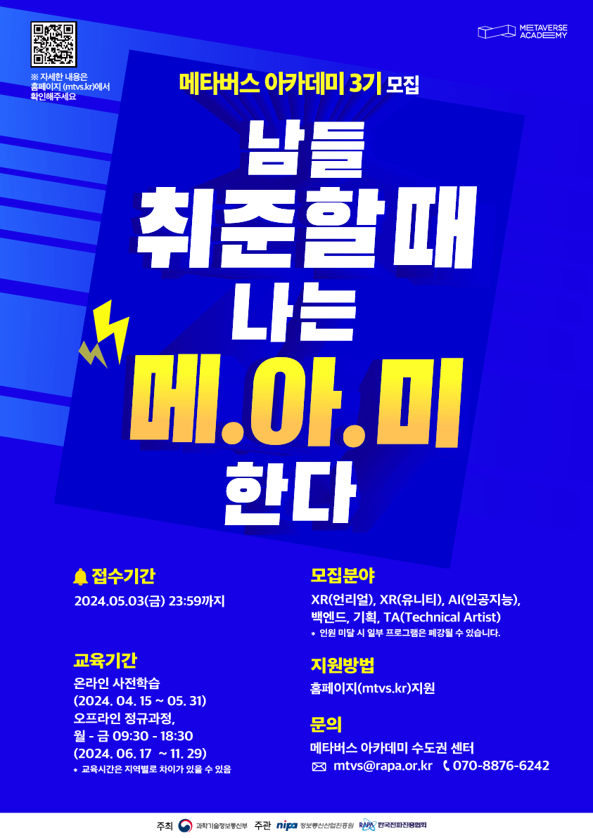 한국전파진흥협회 2024 메타버스 아카데미 3기 추가 모집 ○ 교육개요 - 남들 취준할때 난 메.아.미한다. 과학기술정보통신부 주최,…, 전시,포럼,세미나,축제정보를 마이스포털 코드엠에서 확
