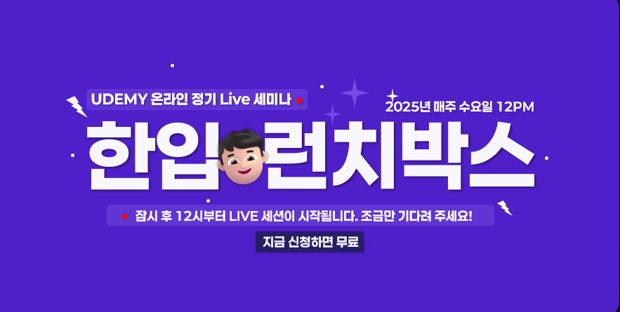 - 매주 수요일 점심시간, Udemy 온라인 정기세미나가 진행됩니다.