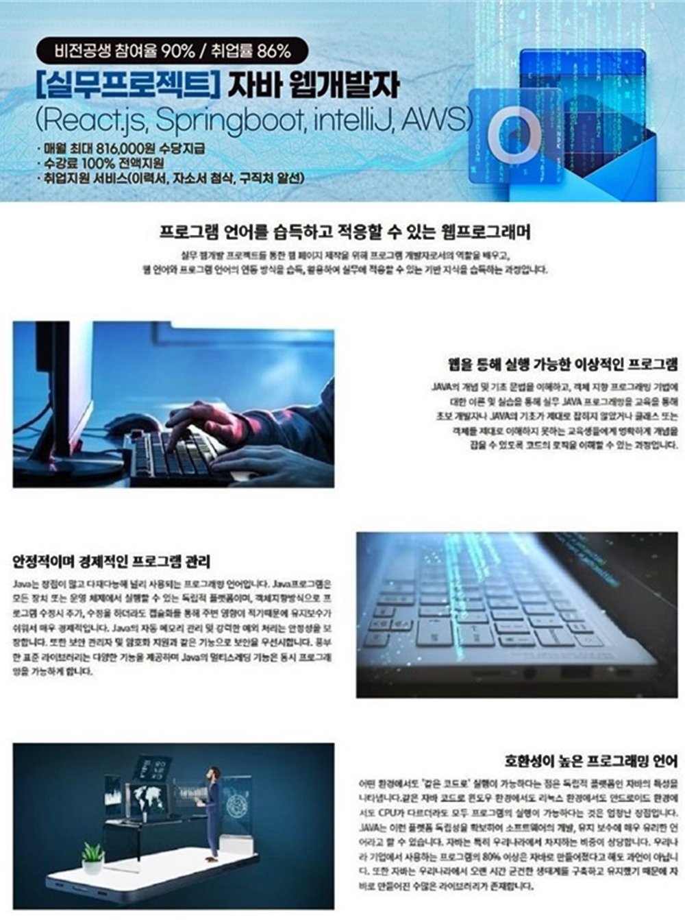- 웹 프론트엔드, 백엔드 프로그램 언어와 기술 습득을 통한 전문 개발자 양성