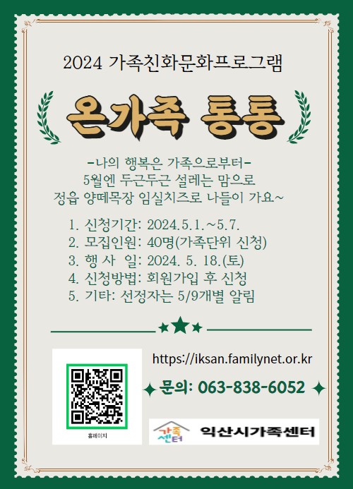 2024년 가족친화문화[On 가족 통통通通] ○ 행사개요 - 나의 행복은 가족으로부터, 5월엔 두근두근 설레는 맘으로 정읍 양떼…, 전시,포럼,세미나,축제정보를 마이스포털 코드엠에서 확인할 수 있
