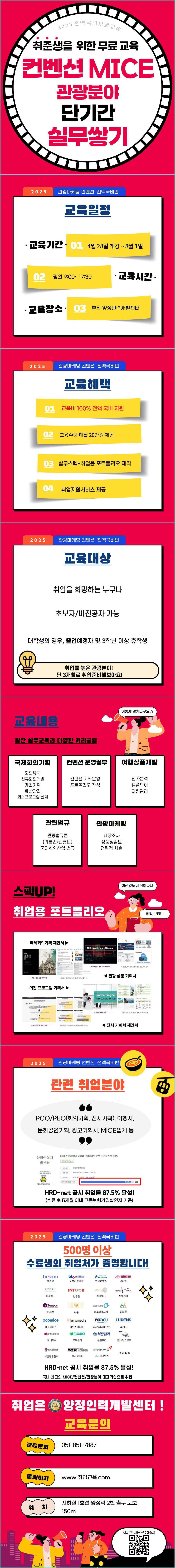 [전액국비무료] 관광마케팅/MICE컨벤션 취업특화교육(스펙/실무완성) ○ 행사개요 - 24년 HRD 공시 취업률 87.5% 달성! …, 전시,포럼,세미나,축제정보를 마이스포털 코드엠에서 확인할 수 있