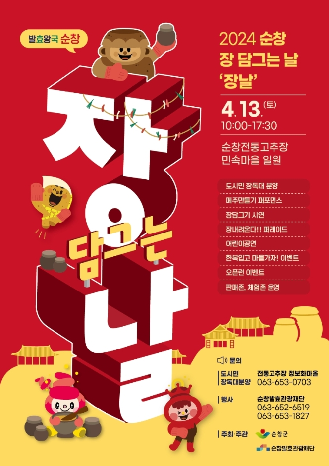 - 오는 4월 13일(토) 순창전통고추장 민속마을 일원에서 2024 순창 장 담그는 날이 열린다.