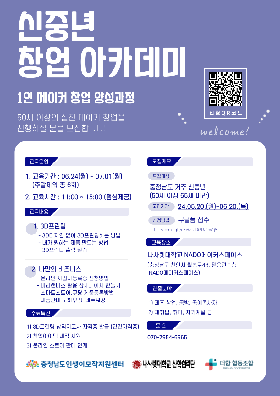 신중년 창업 아카데미 (1인메이커 창업 양성 과정) ○ 행사개요 - 안녕하세요, 충청남도일자리경제진흥원 인생이모작지원센터에서 '…, 전시,포럼,세미나,축제정보를 마이스포털 코드엠에서 확