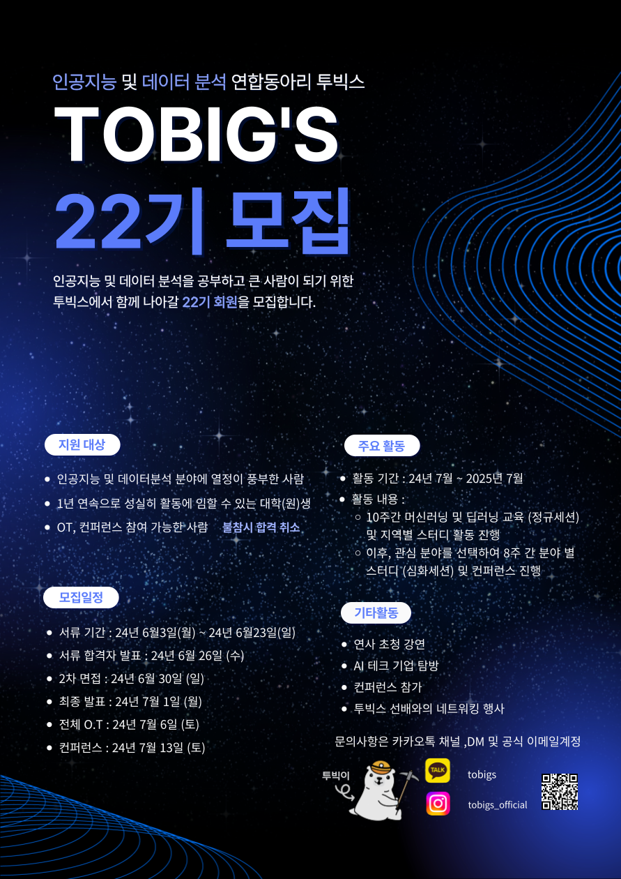 인공지능 및 데이터 분석 대표 연합 동아리 투빅스 TOBIG’s 신입기수(22기) 모집