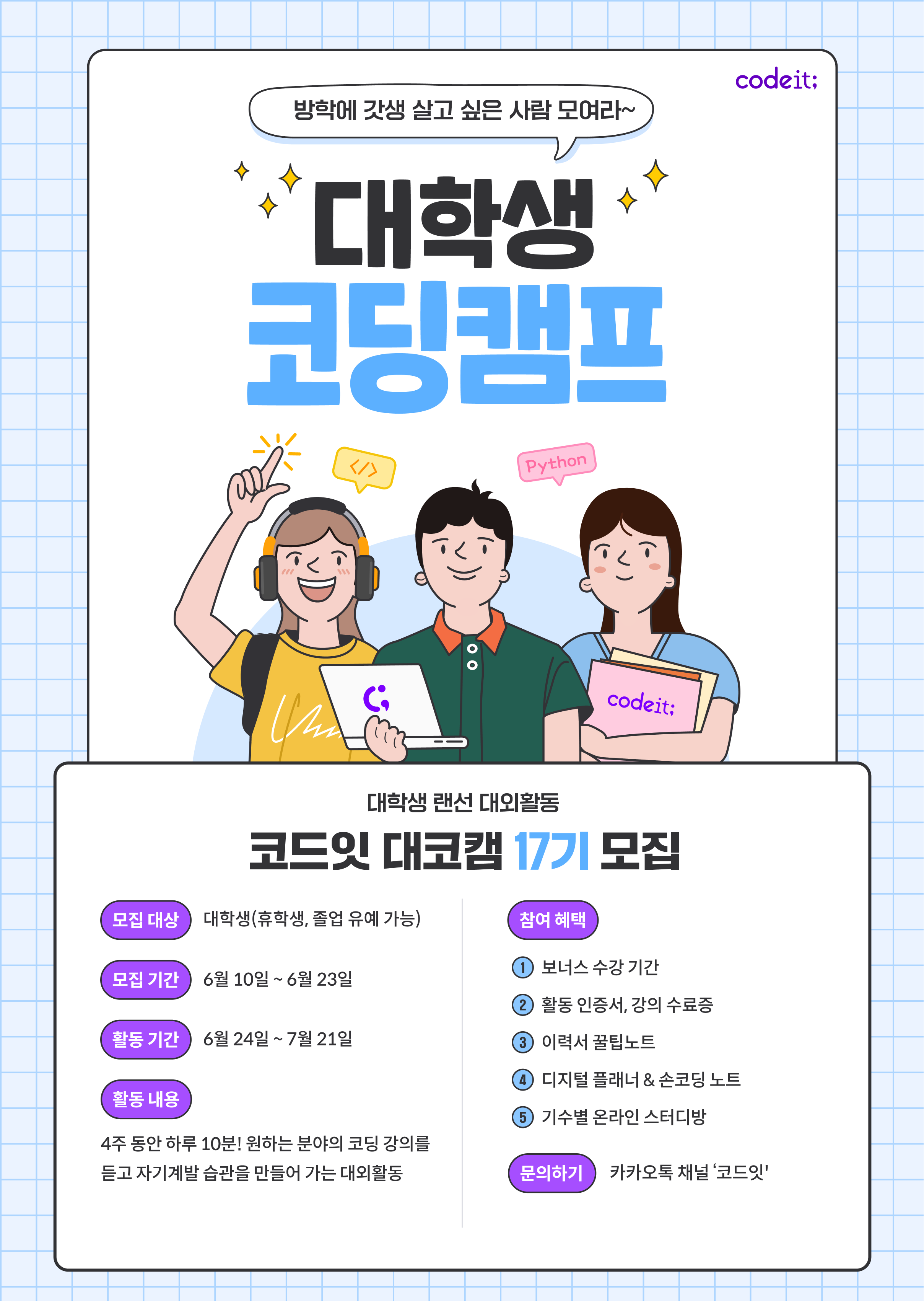 [코드잇] 대학생 코딩 캠프 17기 모집 ○ 교육개요 - 대학생 코딩 대외활동! 대학생 코딩 캠프 대코캠 17기 모집 하루 10…, 전시,포럼,세미나,축제정보를 마이스포털 코드엠에서 확인할 수 있습니