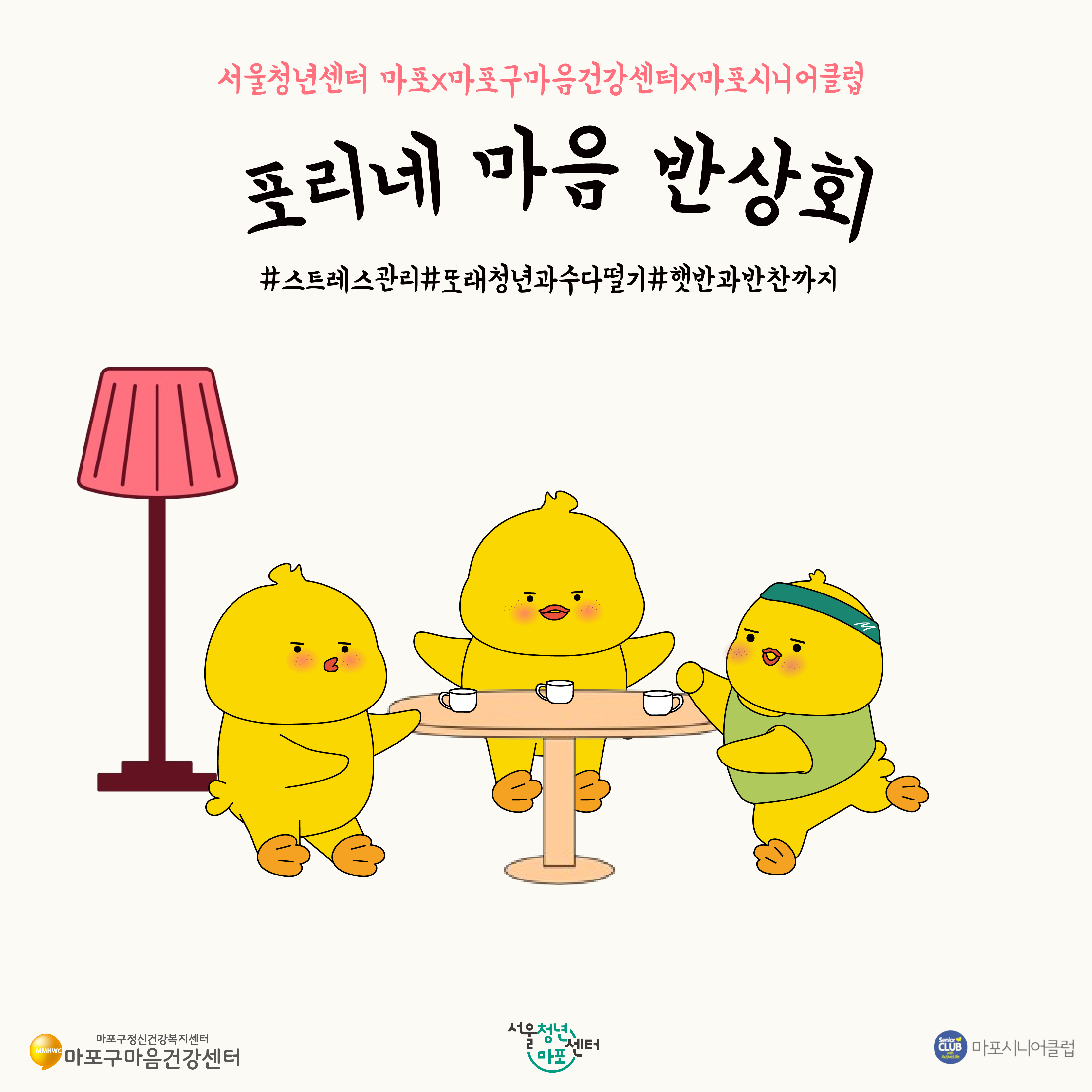 - 서울청년센터 마포에서 <포리네 마음 반상회>에 함께할 참여자를 모집하고 있어요!