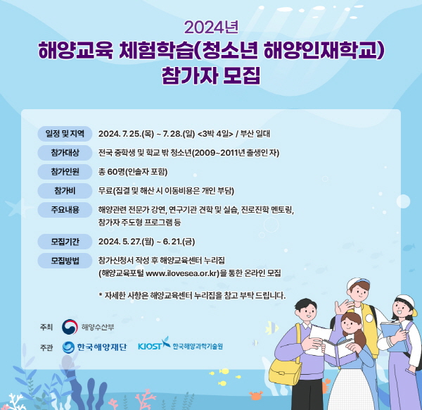 2024년 해양교육 체험학습(청소년 해양인재학교) 참가자 모집 공고