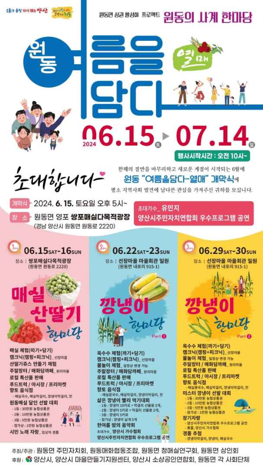 원동면 여름을 담다 ○ 행사개요 - 원동면 여름을 담다 경남 양산시 원동면 일대에서 특산품인 산딸기, 매실, 옥수수 관련 축제이…, 전시,포럼,세미나,축제정보를 마이스포털 코드엠에서 확인