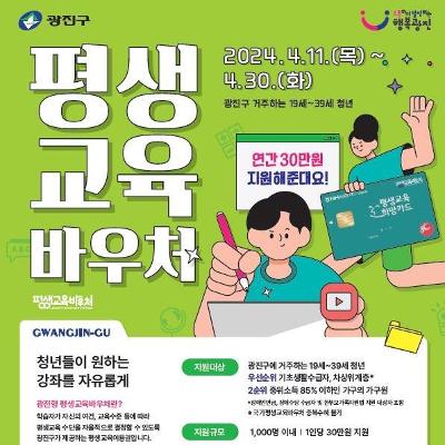광진구청 <광진형 청년 평생교육바우처> ○ 사업개요 - 경제적 이유로 교육을 받지 못하는 청년을 위해 평생교육기관에서 자유롭…, 전시,포럼,세미나,축제정보를 마이스포털 코드엠에서 확인