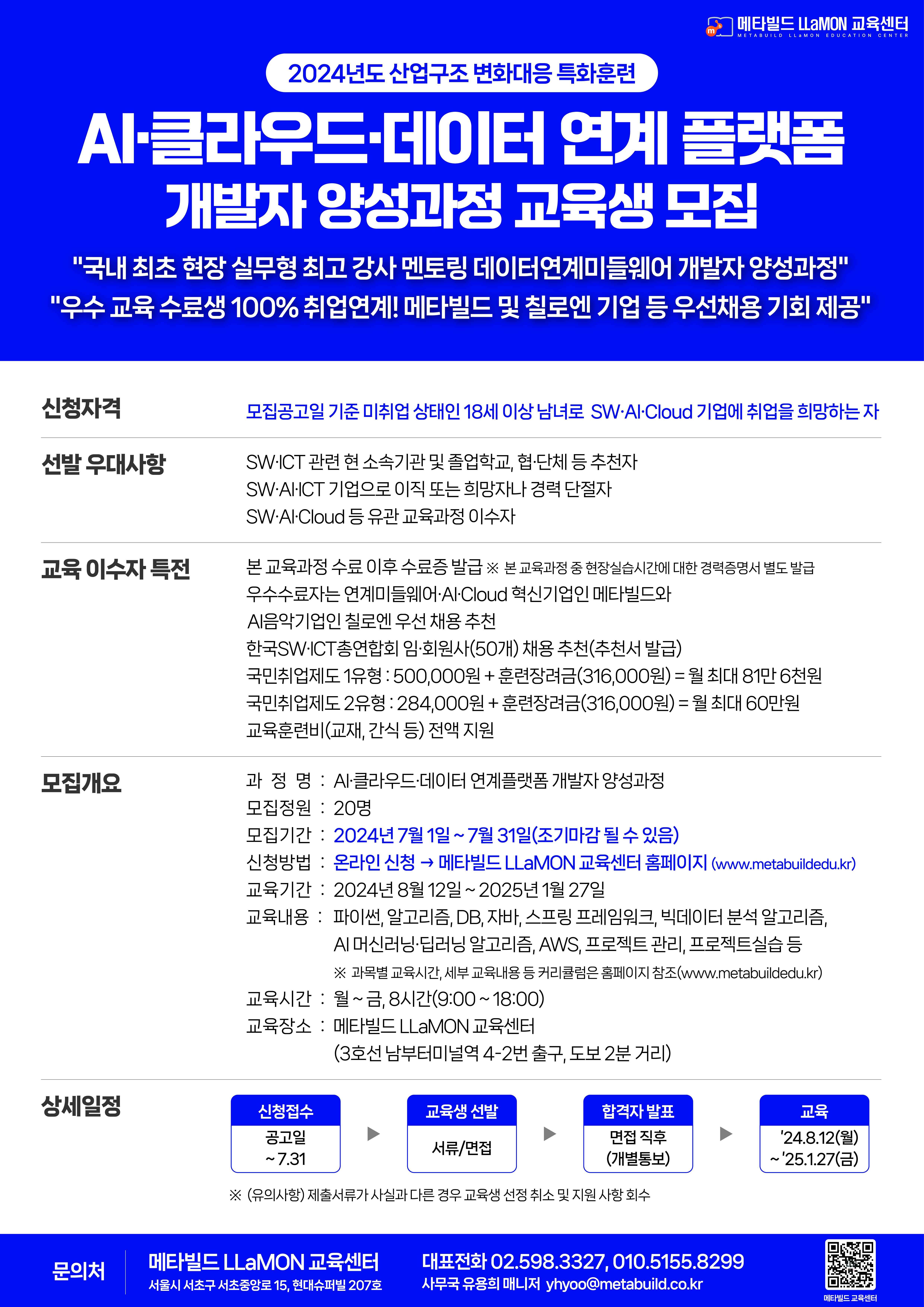 - 행사 장소 : 메타빌드 LLaMON 교육센터 (서울시 서초구 서초중앙로 15, 현대슈퍼빌 207호)