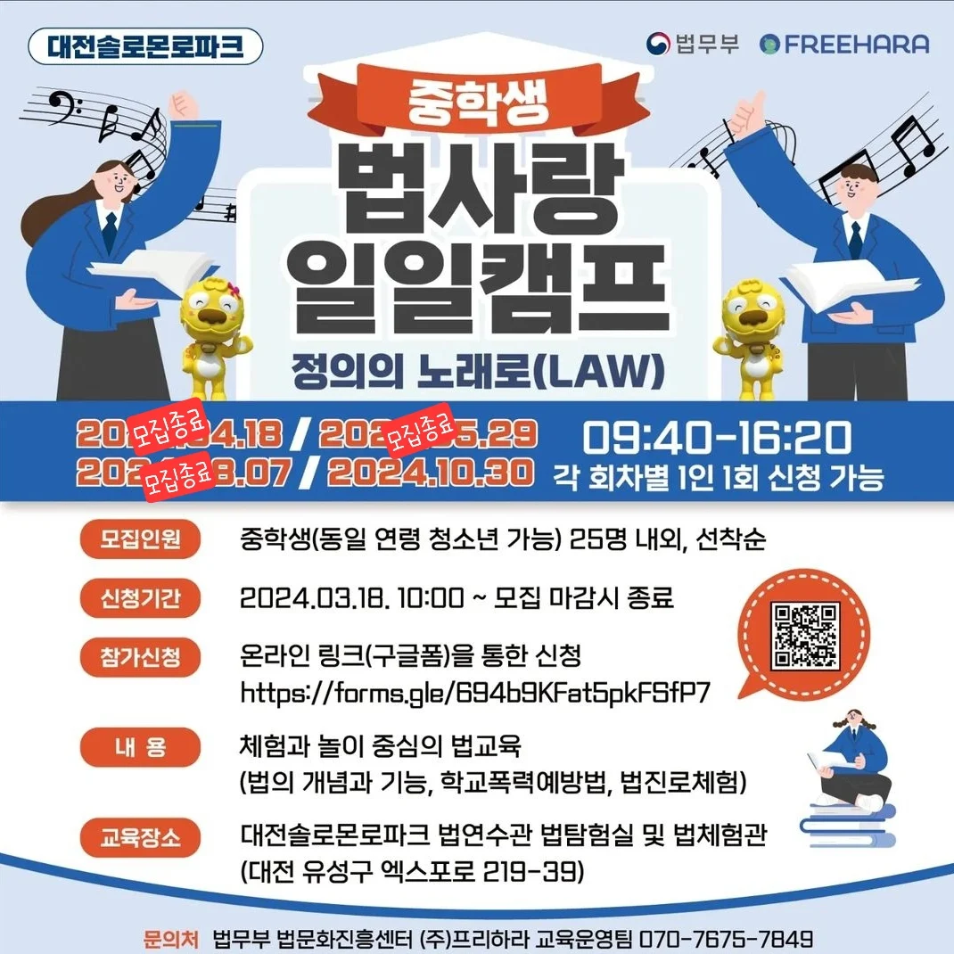 일일캠프 정의의 노래로(LAW) ○ 교육개요 - 2024년, 대전솔로몬로파크에서 중학생(또는 동일연령 청소년) 일일캠프 <정…, 전시,포럼,세미나,축제정보를 마이스포털 코드엠에서 확인할 수 있습니