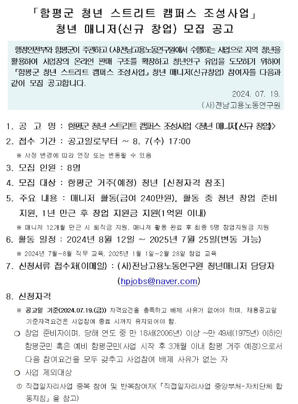 - 접수방법 : 전자우편(전남고용노동연구원 청년매니저 담당자, hpjobs@naver.com)