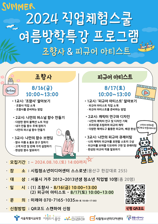 '2024 직업체험스쿨 여름방학 프로그램'에 참여할 초등학교 5~6학년 청소년을 모집합니다