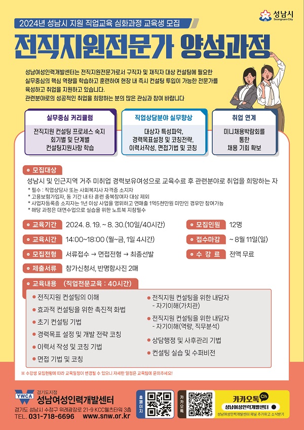 - 성남여성인력개발센터는 전직지원 전문가로서 구직자 및 재직자를