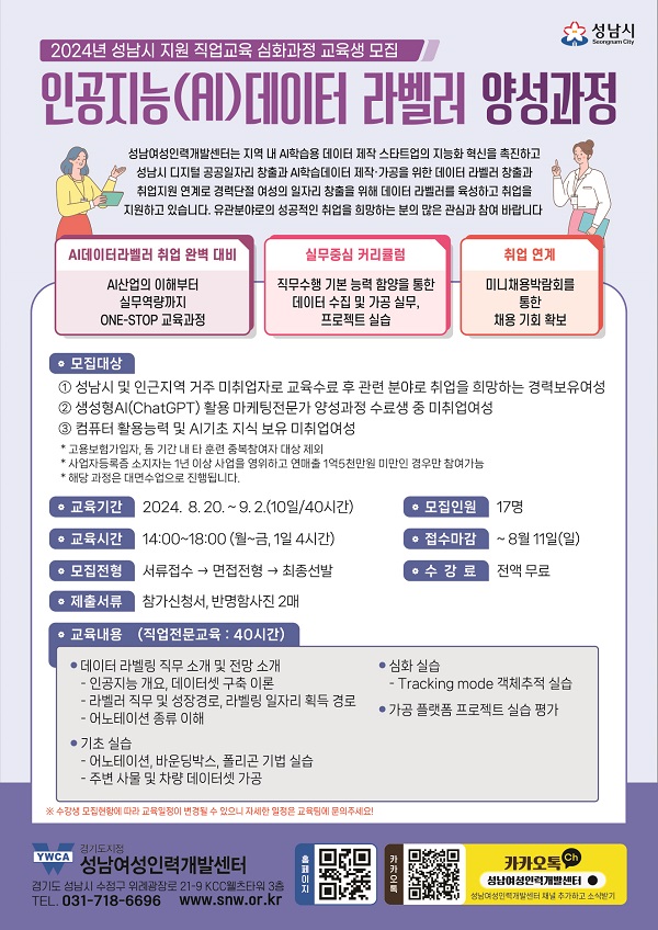 [국비지원 단기·심화 무료교육] 인공지능(AI) 데이터라벨러 양성과정 수강생 모집 ○ 교육개요 - 성남여성인력개발센터는 지역 내 AI 학…, 전시,포럼,세미나,축제정보를 마이스포털 코드엠에서