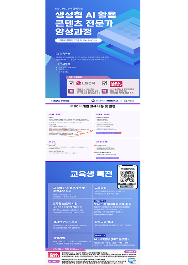 MBC 비대면 과정 생성형 AI 활용 콘텐츠 전문가 양성과정 모집 ○ 행사개요 - 차세대 3D 시네마틱 콘텐츠 제작에 포괄적 전문지식을…, 전시,포럼,세미나,축제정보를 마이스포털 코드엠에서 확인