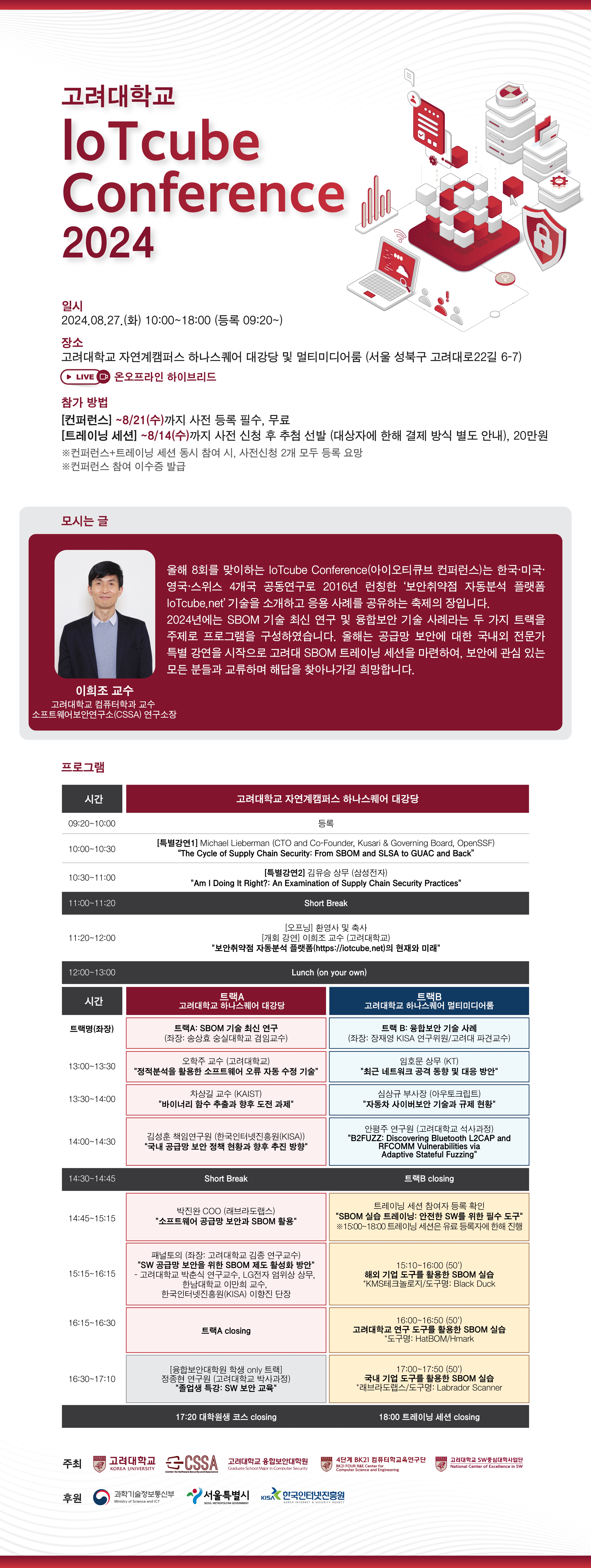 - 11:20~12:00 : "보안취약점 자동분석 플랫폼(https://iotcube.net)의 현재와 미래"
