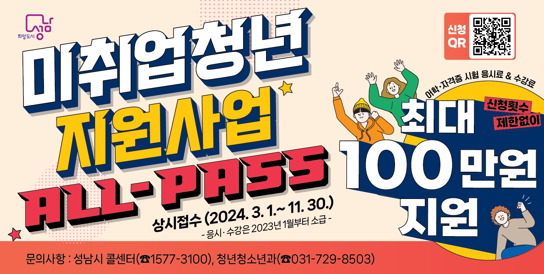 2024년 미취업 청년 지원사업(ALL-Pass/올패스) 대상자 모집 ○ 사업개요 - 성남시에서는 미취업 청년들을 대상으로 구직활동에 …, 전시,포럼,세미나,축제정보를 마이스포털 코드엠에서 확인할 수
