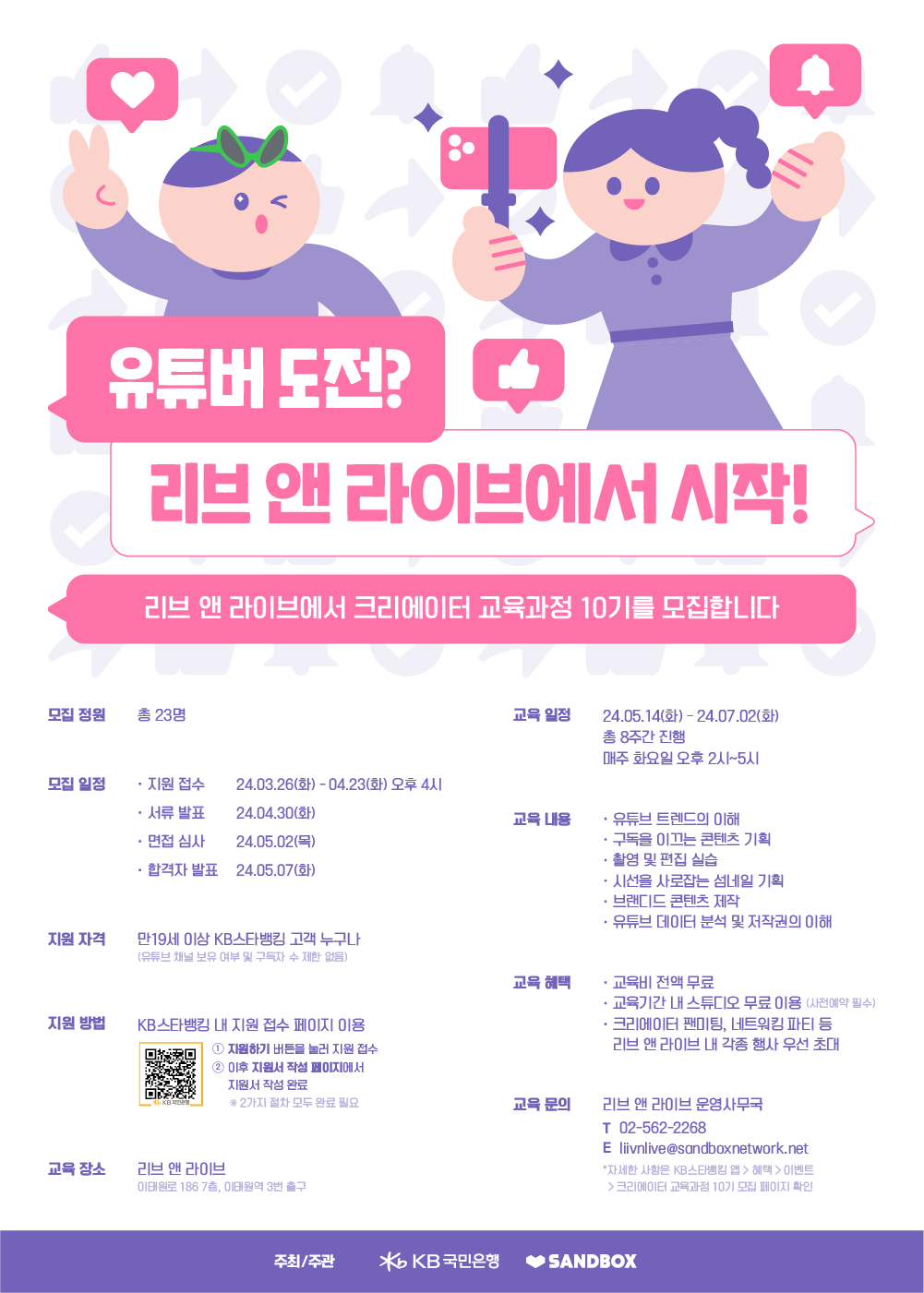 리브 앤 라이브 크리에이터 교육 과정 교육생 10기 모집 ○ 교육개요 - 크리에이터의 꿈, 현실이 되다! KB국민은행과 샌드박스네트워크…, 전시,포럼,세미나,축제정보를 마이스포털 코드엠에서