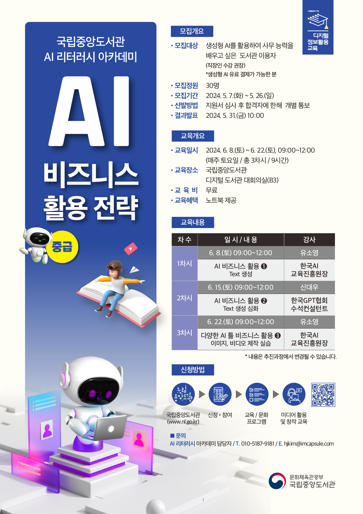 교육, 세미나 - 국립중앙도서관 AI 비즈니스 활용 전략(중급) 교육생 모집