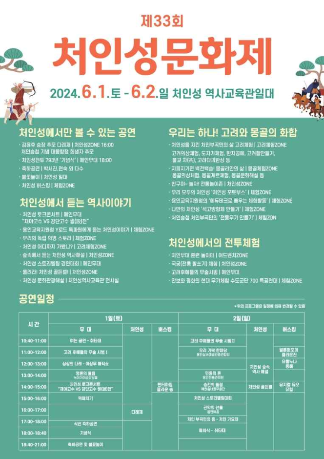 제33회 처인성문화제 ○ 행사개요 - 처인성문화제는 김윤후 승장과 처인부곡민의 호국정신을 기리며 고려시대 처인승첩의 가치를 되새…, 전시,포럼,세미나,축제정보를 마이스포털 코드엠에서