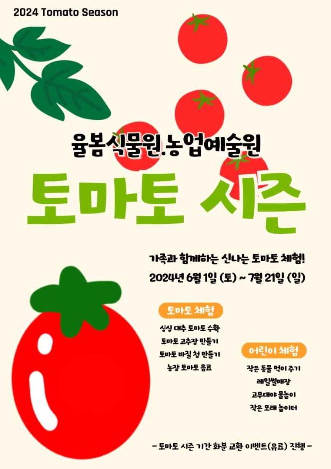 율봄식물원 토마토 시즌 ○ 행사개요 - 싱싱한 토마토의 계절, 율봄식물원에서 토마토를 활용한 체험과 아이들을 위한 즐길거리를 만…, 전시,포럼,세미나,축제정보를 마이스포털 코드엠에서