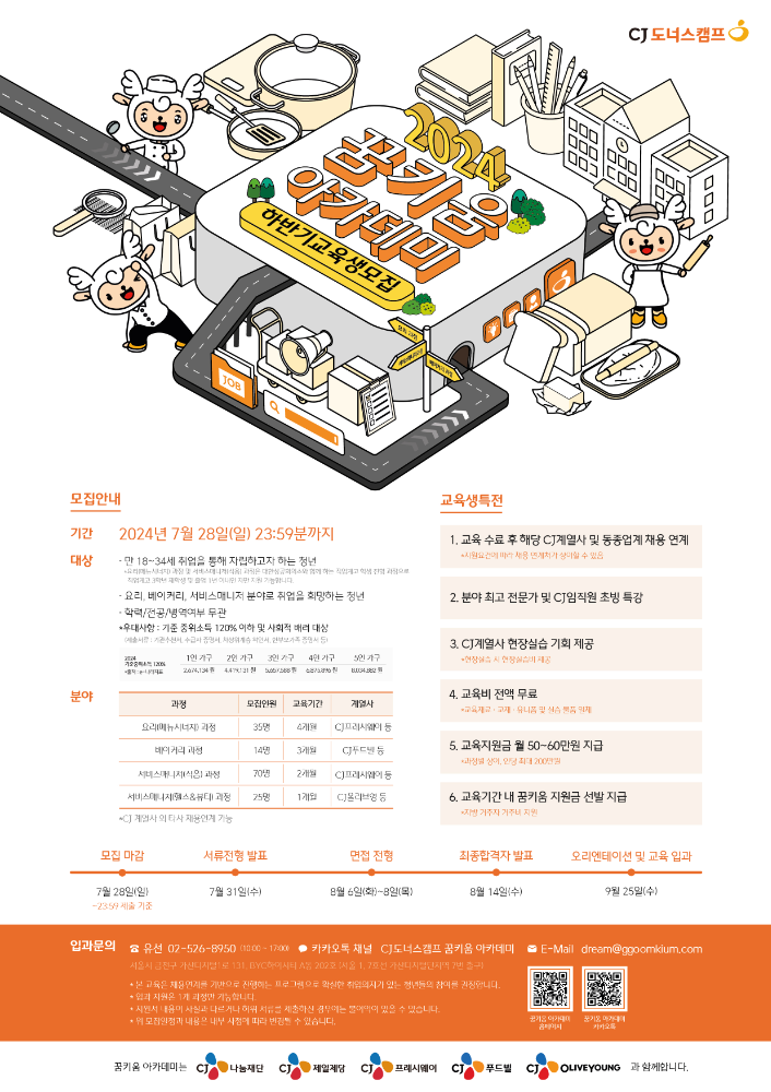 2024 꿈키움 아카데미 교육생 모집 ○ 교육개요 - 안녕하세요! CJ도너스캠프 꿈키움 아카데미에서 요리, 베이커리, 서비스매니저…, 전시,포럼,세미나,축제정보를 마이스포털 코드엠에서 확인할