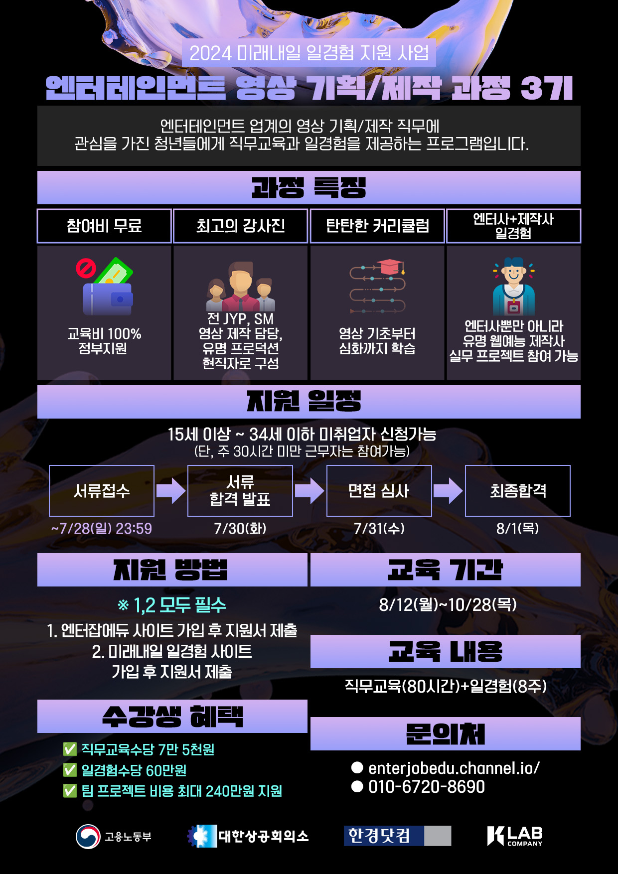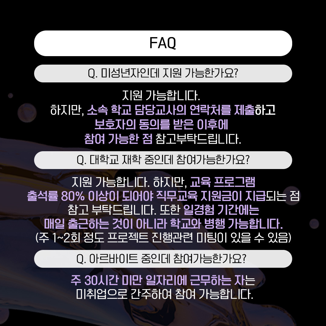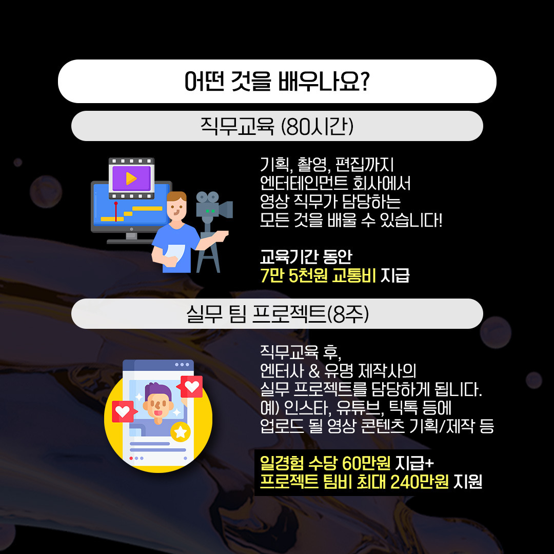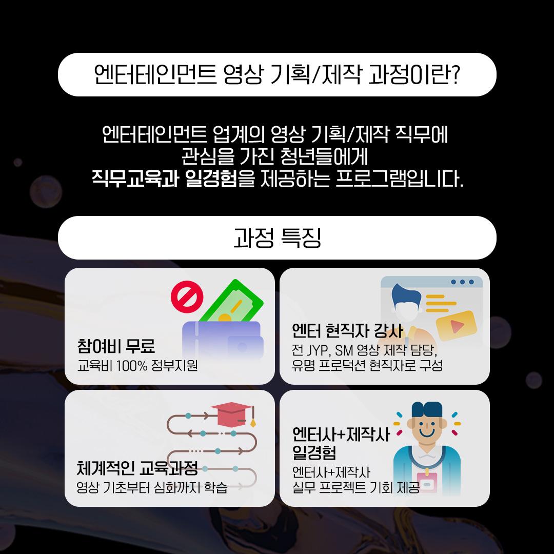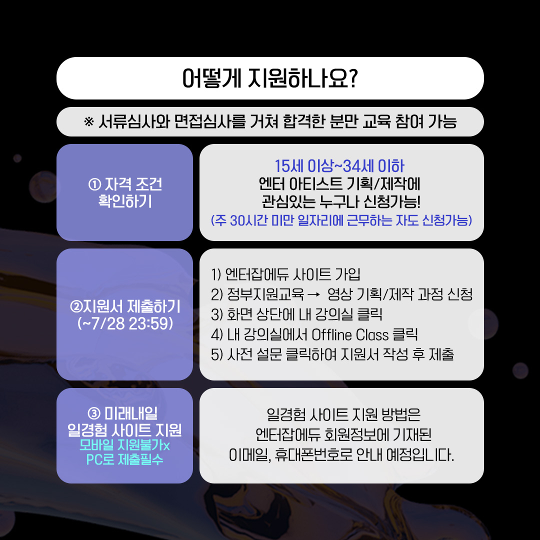 - 15세 이상~34세 이하 엔터 영상 직무에 관심있는 누구나 신청가능!