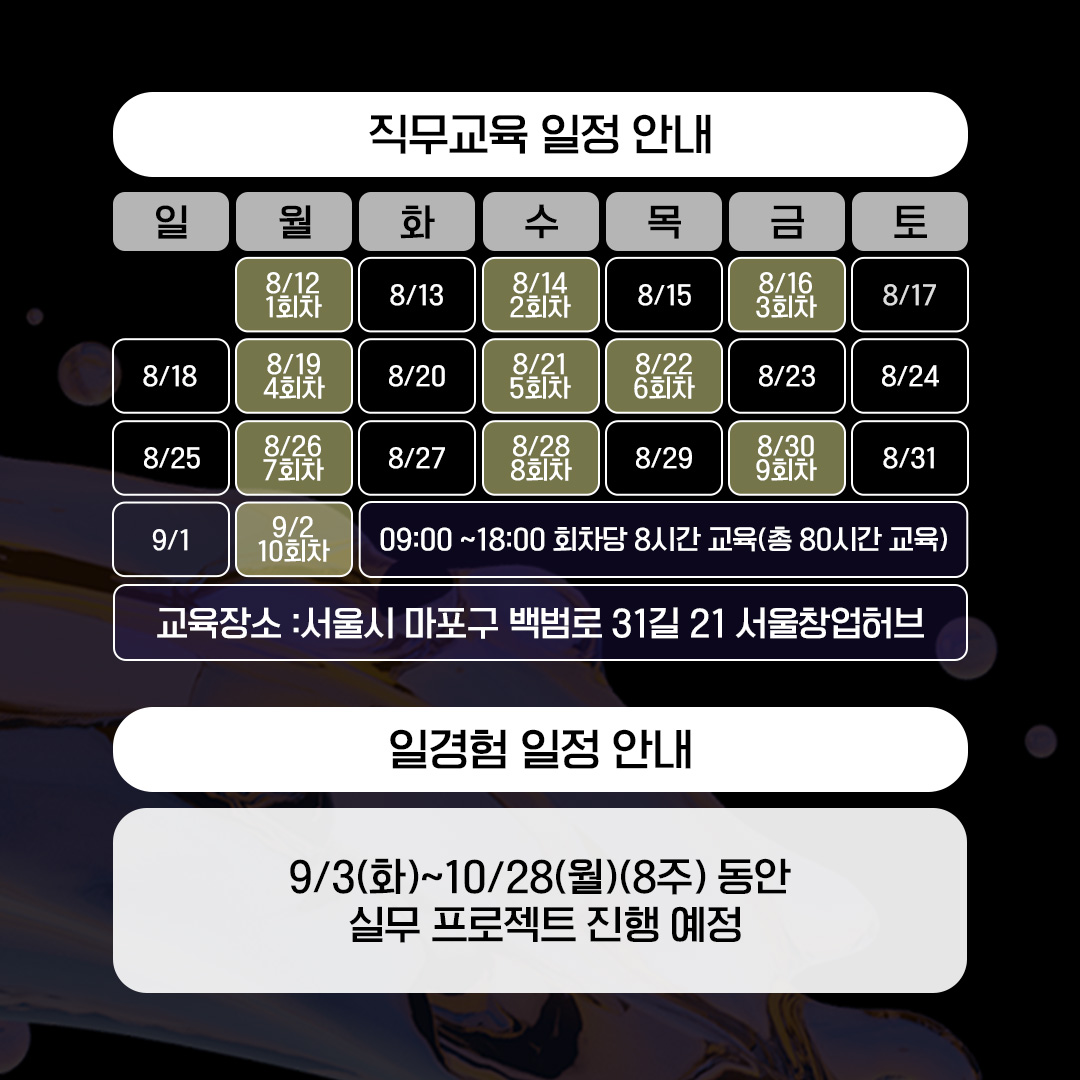 - 1회차 8/12(월) 09:00~18:00