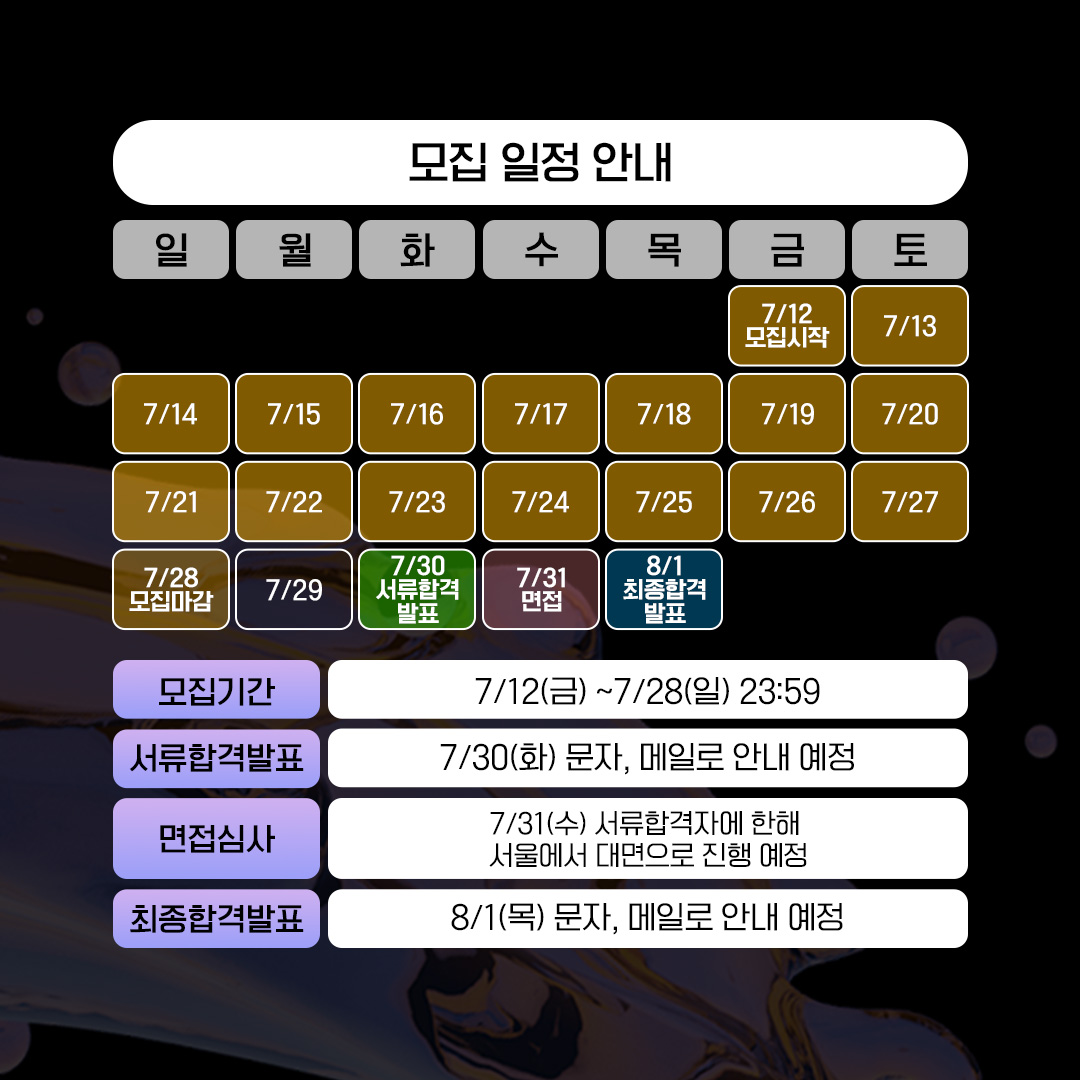 - 최종합격발표: 8/1(목) 문자, 메일로 안내 예정