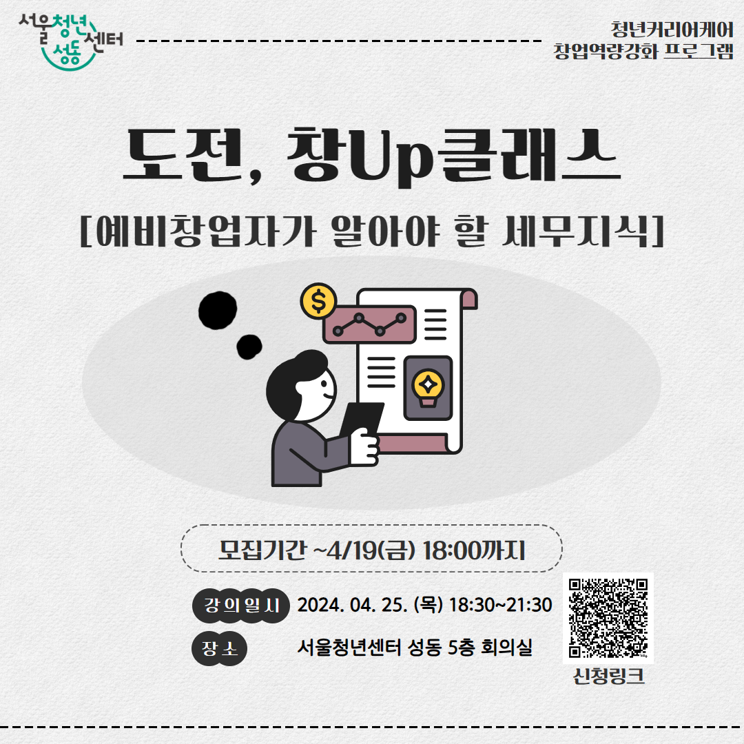 서울청년센터 성동 <도전창업클래스-예비창업자가 알아야 할 세무 지식> 강의 ○ 교육개요 - 창업을 꿈꾸는 예비창업청년들을 대상…, 전시,포럼,세미나,축제정보를 마이스포털 코드엠에서 확