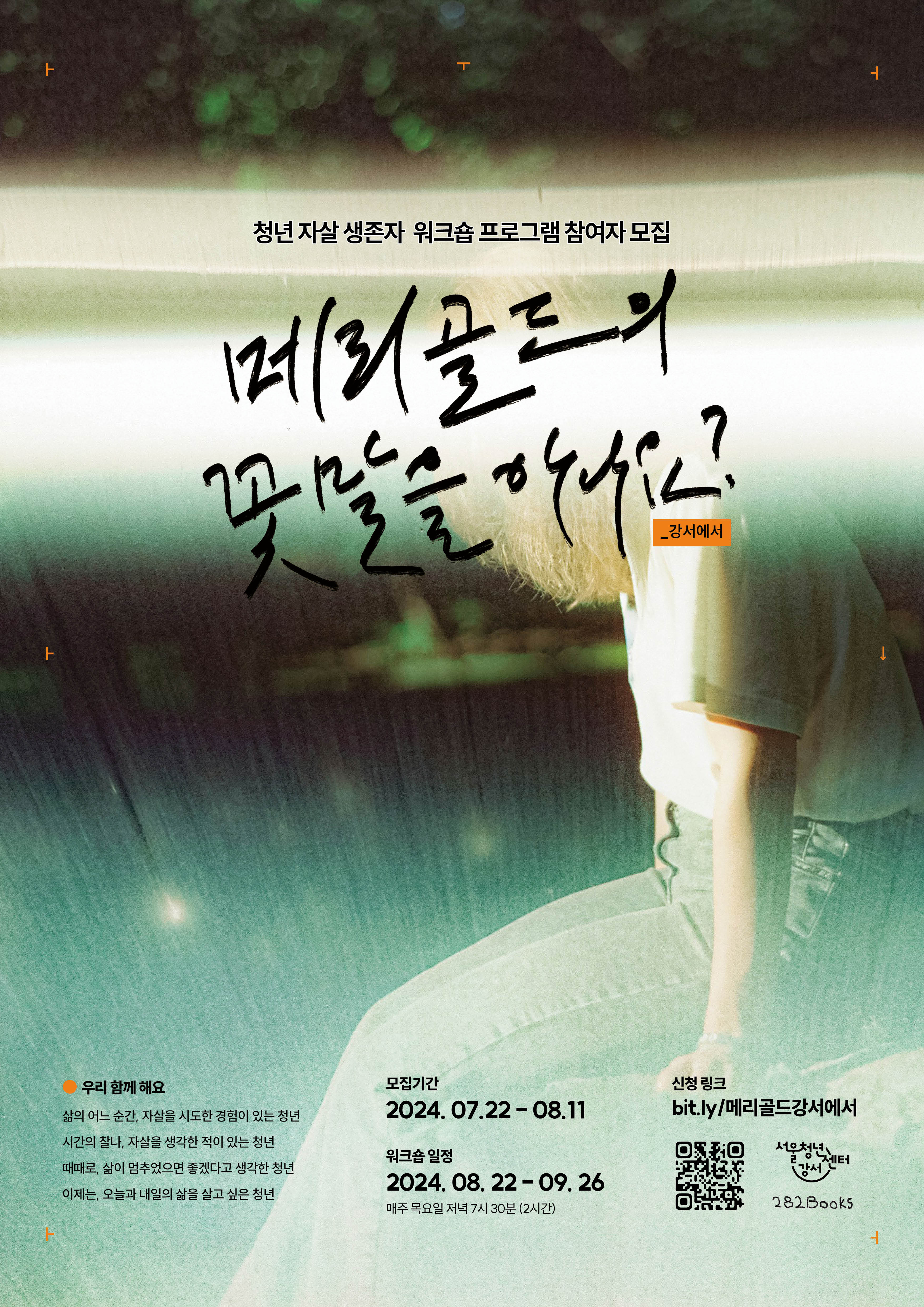 - 누구나 살다가 한 번 쯤, 잠시 삶의 걸음을 멈추고 싶은 때가 있죠. 프로젝트 <메리골드의 꽃말을 아나요? _강서에서>는 청년 자살 생존자들의 심리/정서적 안정을 찾을 수 있는 워크숍 프로그램과 더불어 사회가 가진 '청년 자살'에 대한 부정적인 시선을 완화하는 인식개선 전시회가 진행되는 예술 기반 사회적처방 프로젝트입니다.