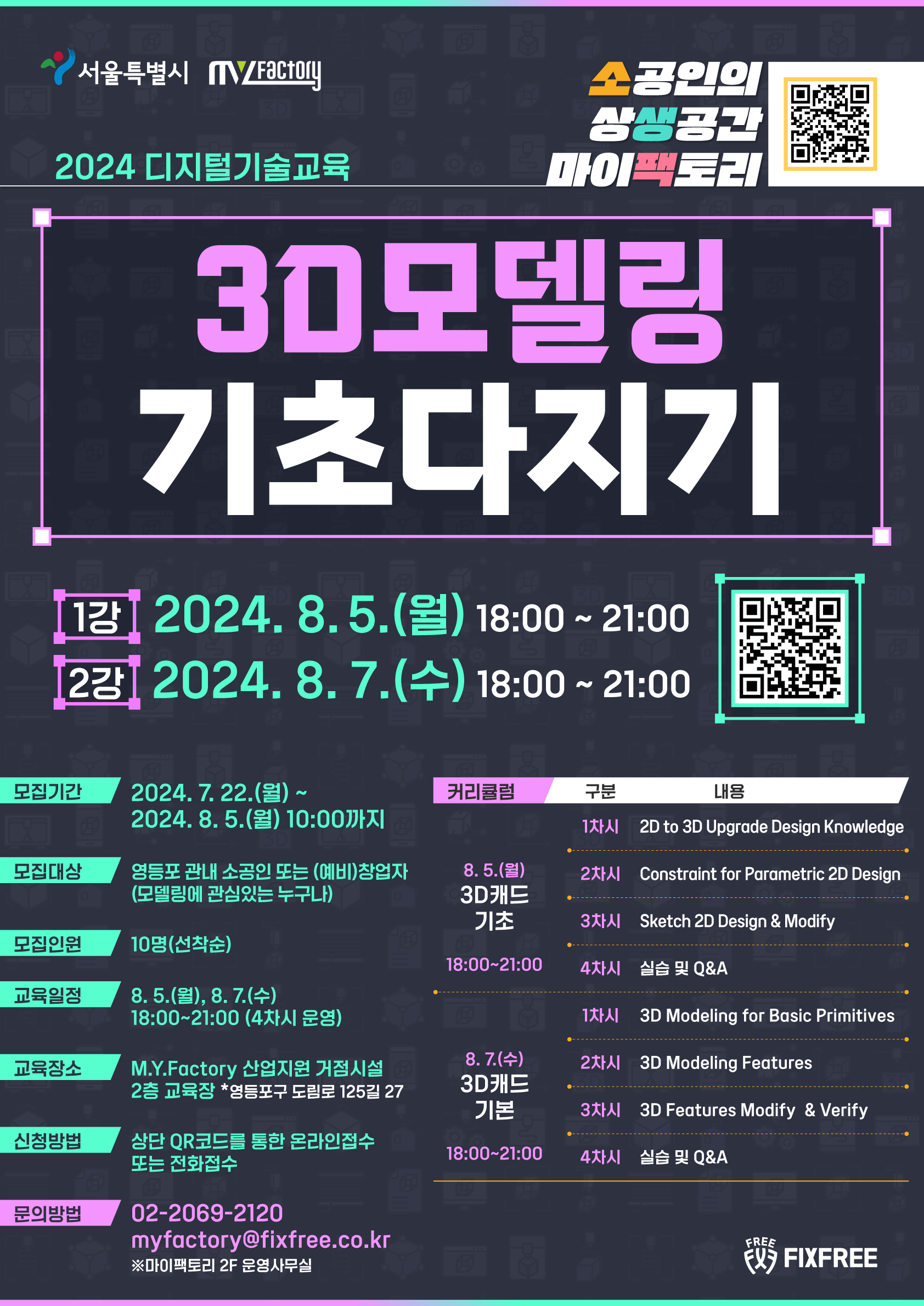 디지털기술교육 3D모델링 기초다지기 ○ 행사개요 - 안녕하세요! 영등포 마이팩토리 M.Y.Factory 입니다. 이번 진행하게 되…, 전시,포럼,세미나,축제정보를 마이스포털 코드엠에서 확인할 수 있습