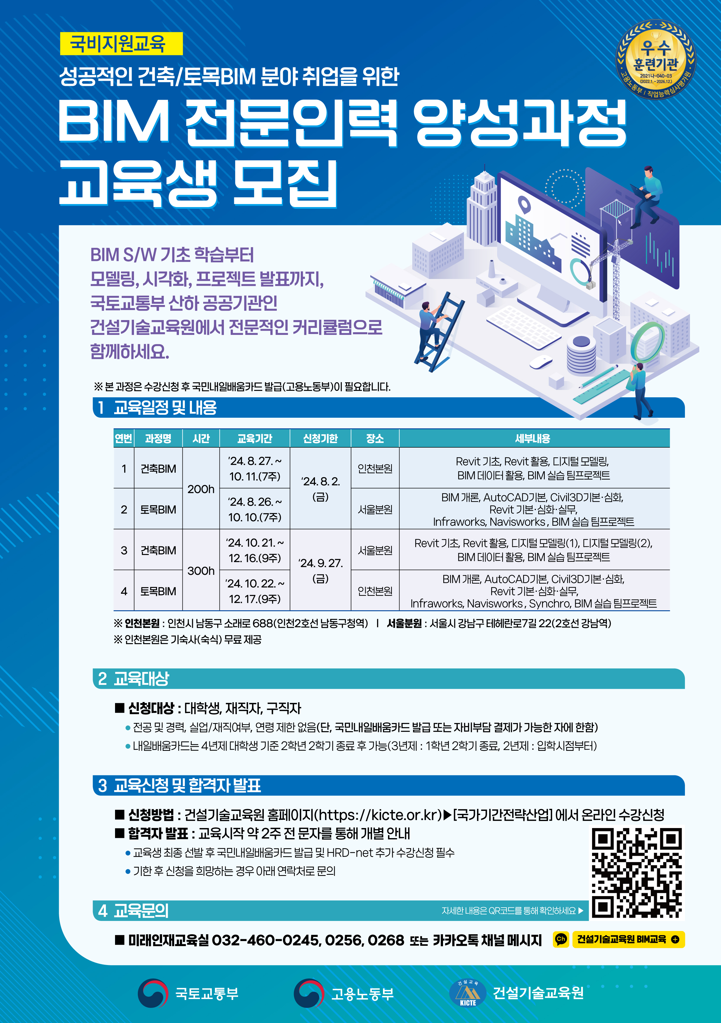 - 국토교통부 산하 공공기관인 건설기술교육원에서 건축/토목 BIM 교육생을 모집합니다.