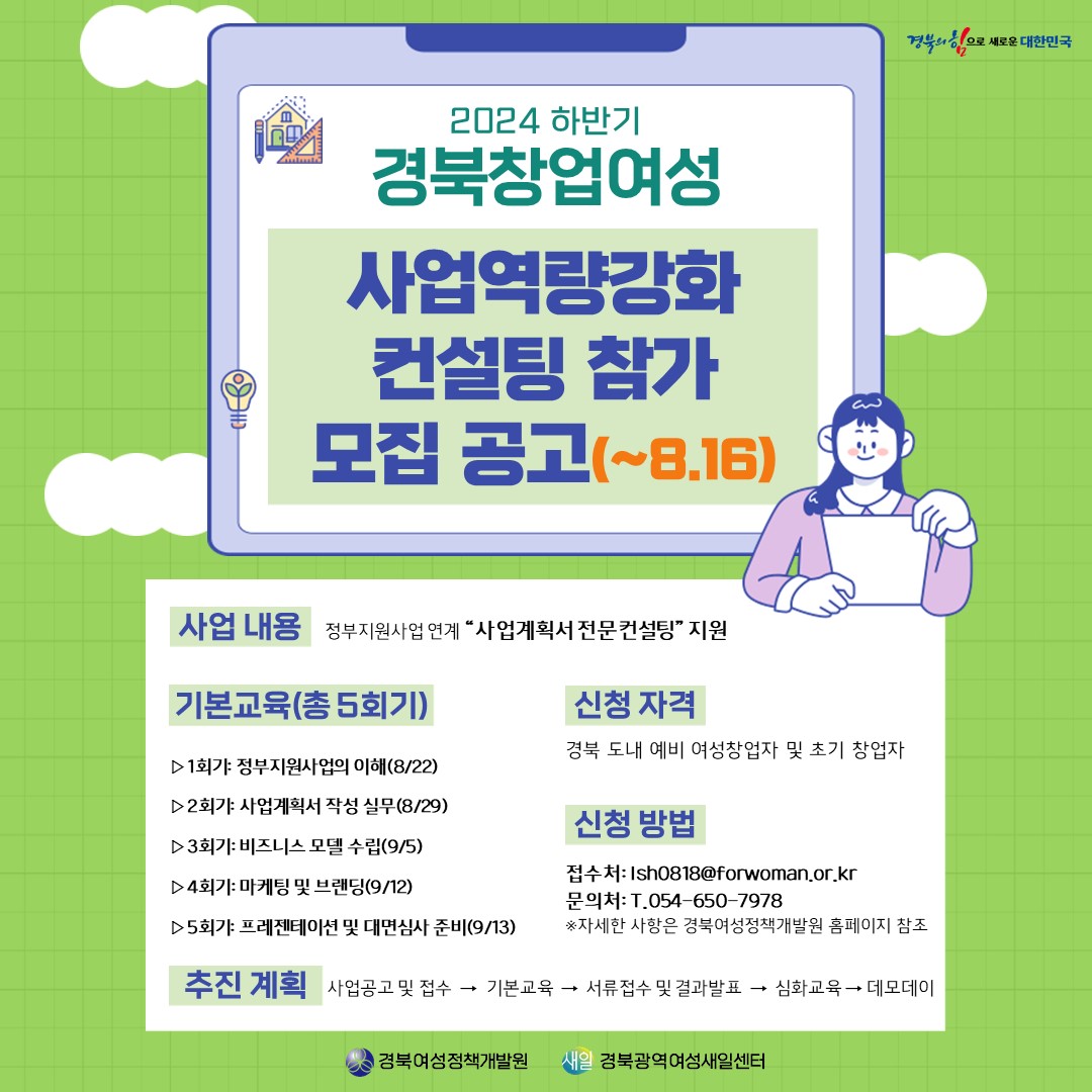 경북 창업여성 사업역량강화 컨설팅 ○ 교육개요 - 도내 예비·초기 여성창업자 대상 정부지원사업 선정에 필요한 사업계획서 전문 컨설…, 전시,포럼,세미나,축제정보를 마이스포털 코드엠에